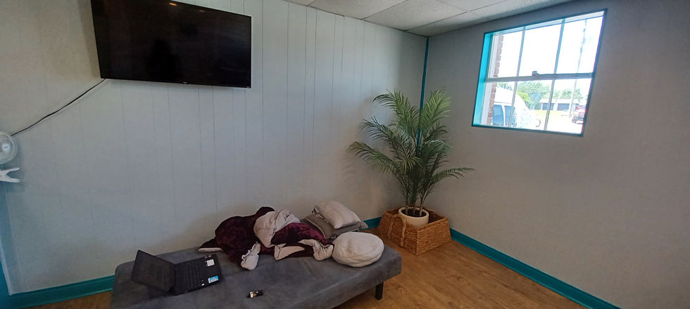 This project showcases the cozy and inviting interior of The Epic Life Center wellness store, featuring a reception counter, couch, and plant. It also includes images of the turquoise and teal walls with furniture, as well as a room partition with a 'Treatment Room Coming Soon' sign.